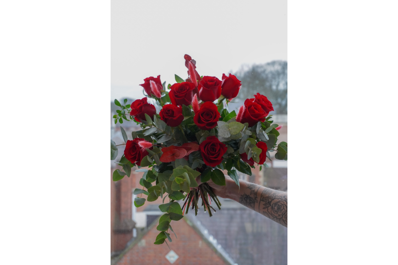 Amour: The OG Valentines day gift because nothing says I love you quite like Roses, and our classic 12 Red Rose bouquet does just that! Paired with Eucalyptus and pistachio foliage its simple, romantic and timeless.