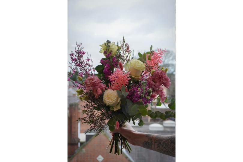 This hand tie ranges from hot pinks to soft blush tones and is bursting with a selection of beautifully scented Blooms, such as Stocks, Ginister and Roses.